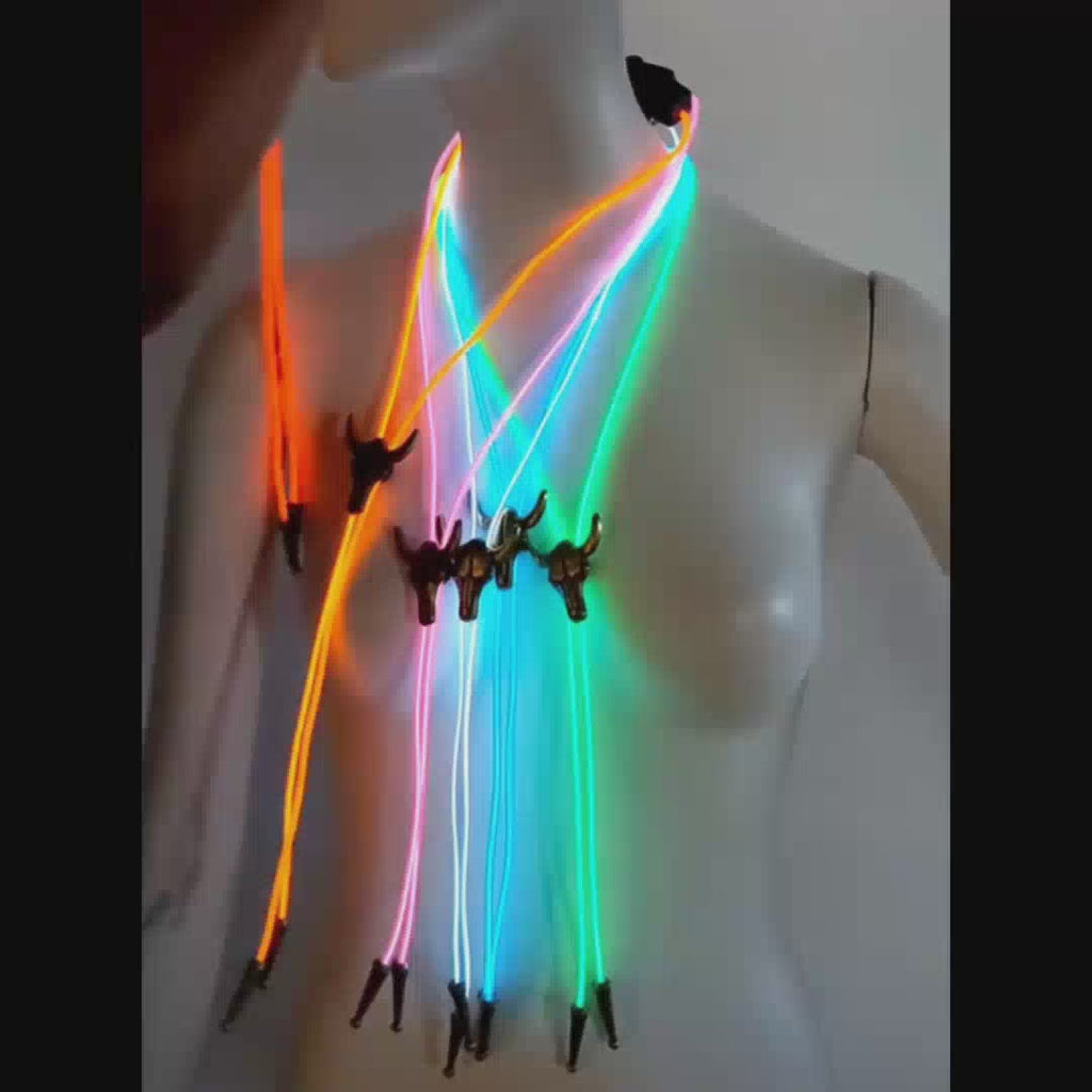 Our Light-up Bolo Tie brings cowboy fantasy to life with modern illumination! This innovative accessory features a traditional cattlehead design enhanced with vibrant LED lighting that makes you stand out at any western-themed event. The adjustable leather cord ensures a comfortable fit while the light-up element adds that perfect touch of Neon Cowboys magic to your outfit. The cattlehead pendant houses bright LED lights that create an eye-catching glow in multiple colors, combining classic western style with contemporary light technology. It's the perfect blend of tradition and innovation for those looking to elevate their western wear. Pair with our Neon Cowboys Hat for a complete illuminated cowboy ensemble with LED bolo tie, light up western tie, cattlehead necklace, cowboy light accessories, and western fashion.