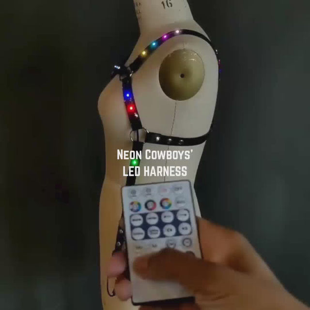 Remote Controlled LED Harness. Your next outfit will immediately be elevated by our Remote Controlled LED Harness. Anyone can wear this new accessory over their favorite basics to create an unforgettable statement piece. Choose from a range of colors and programmable patterns to appear on the LEDs using the given remote and be ready to light up the night!